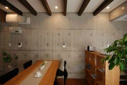 打ちっぱなしのコンクリートに、木ルーバーを使用することで外観に重厚感と和らぎが調和して心地の良い洗練された集合住宅となってます。室内の階段の上部から陽の光を取り込み、室内に開放的な空間を作り出します。